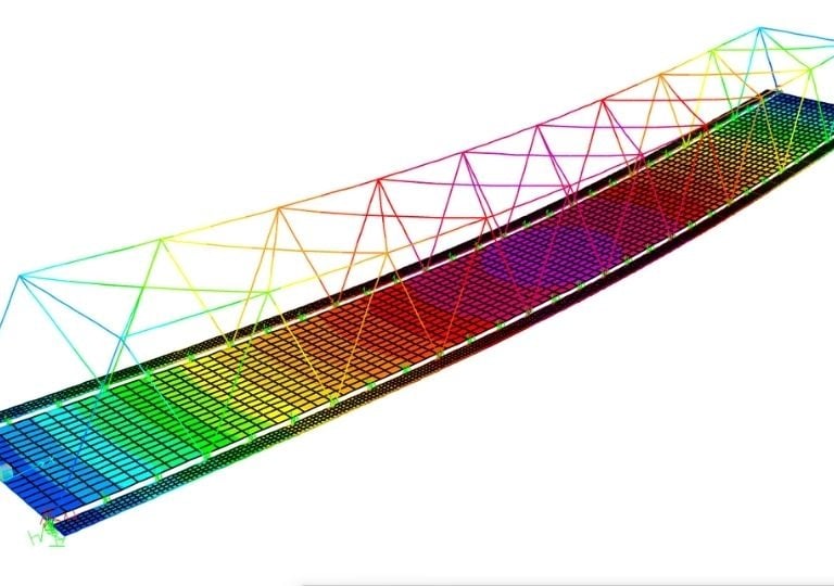 Modelado y análisis de elementos finitos (FEM) de la estructura completa, validado con los datos de campo, para simular el comportamiento bajo cargas dinámicas y los efectos de fatiga, así como para determinar la capacidad portante y la vida útil remanente.