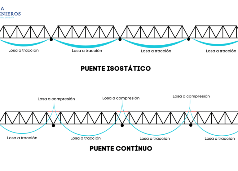 Un puente reticulado metálico de un solo tramo, isostático por naturaleza, presenta un comportamiento estructural relativamente sencillo. Las bridas superiores están predominantemente sometidas a compresión, mientras que las bridas inferiores y la losa de concreto (si es de tablero inferior) operan principalmente bajo tracción por los momentos flectores positivos. En este escenario, la fatiga de la losa, aunque posible, se concentraría en un rango de esfuerzos de tracción.