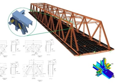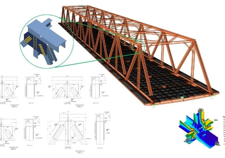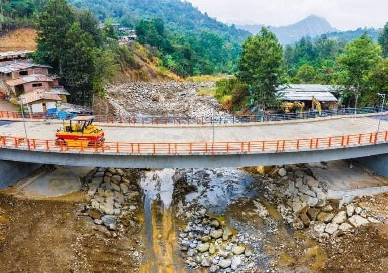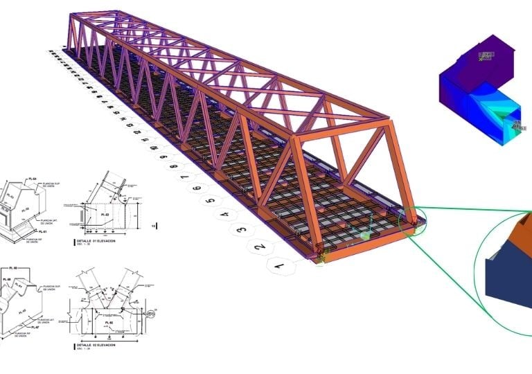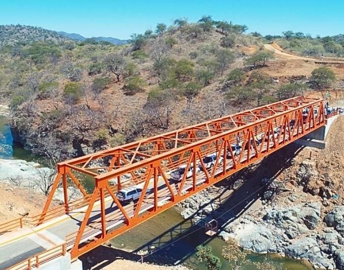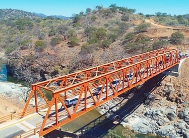 Puente metálico reticulado de tablero bajo, 75m de longitud. Solución diseñada con enfoque integral que incluye el montaje de la superestructura. Garantiza estabilidad y seguridad en zona fronteriza, optimizando costos y respondiendo a condiciones topográficas y logísticas del entorno rural intensivo.